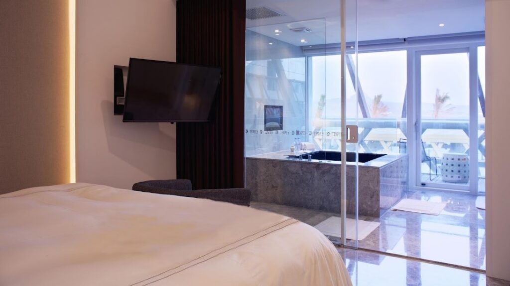 擁有寧靜私密空間的豪華景觀湯屋,房內增設了淋浴區、獨立洗手間、舒適雙人床以及梳妝台,以自然石材切砌的浴室,也特別設置冷、熱兩種水池,讓您沐浴在富涵碳酸氫鈉的美人湯之際,還能感受SPA水療的身心舒暢,面對大片景觀窗,室外山水盡收眼底
