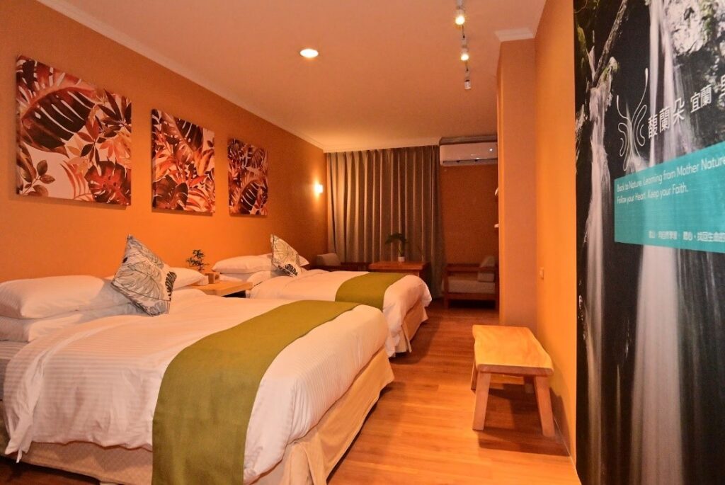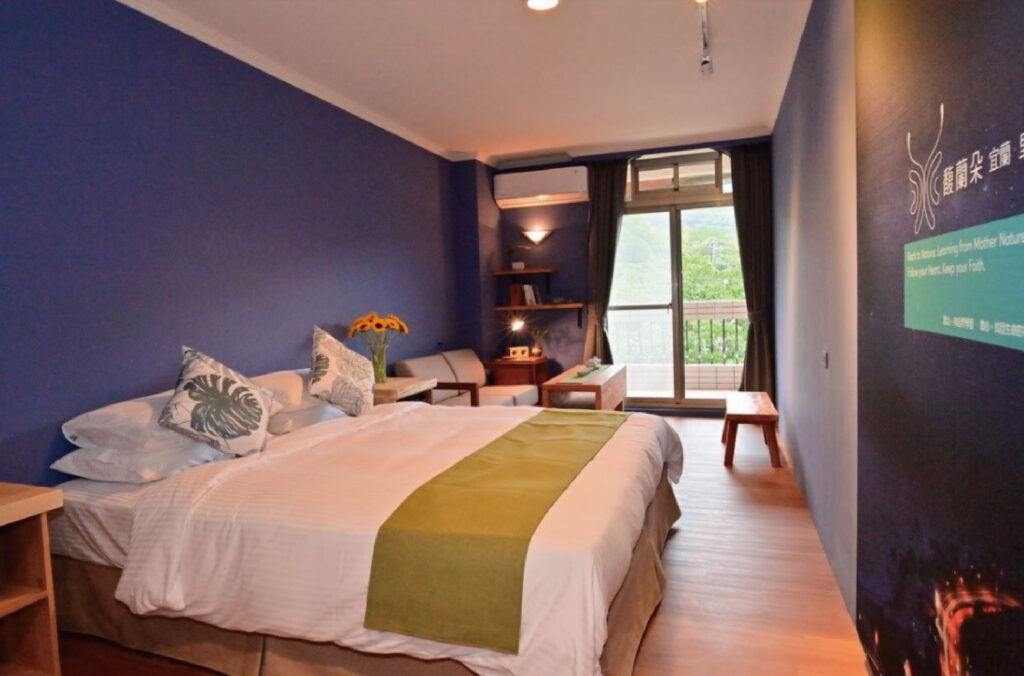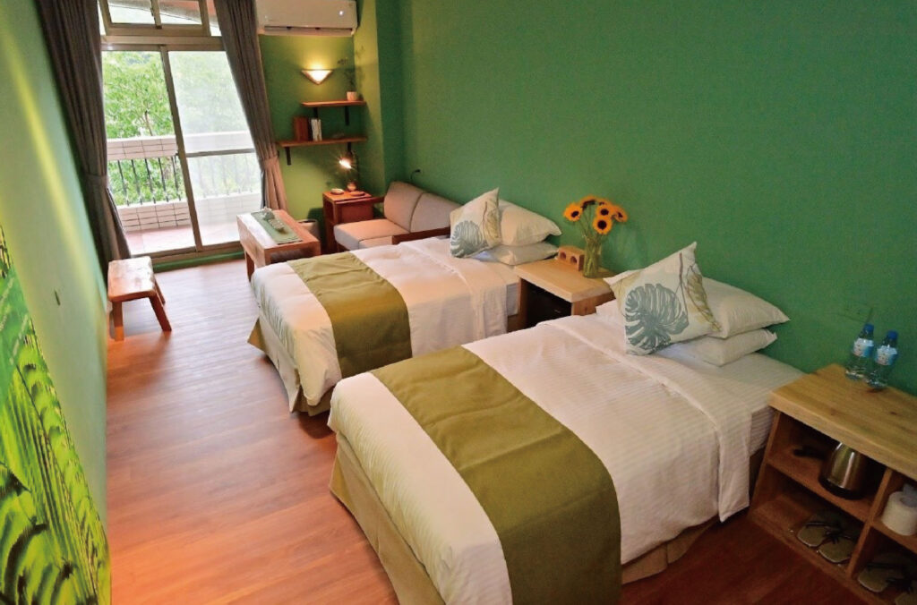 客房以海洋天空藍、森林草綠、溫暖大地三個色系,搭配原木家飾,感受住在森林裡的靜謐與美好。