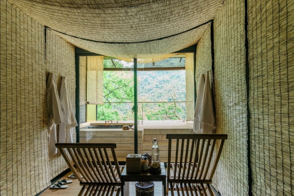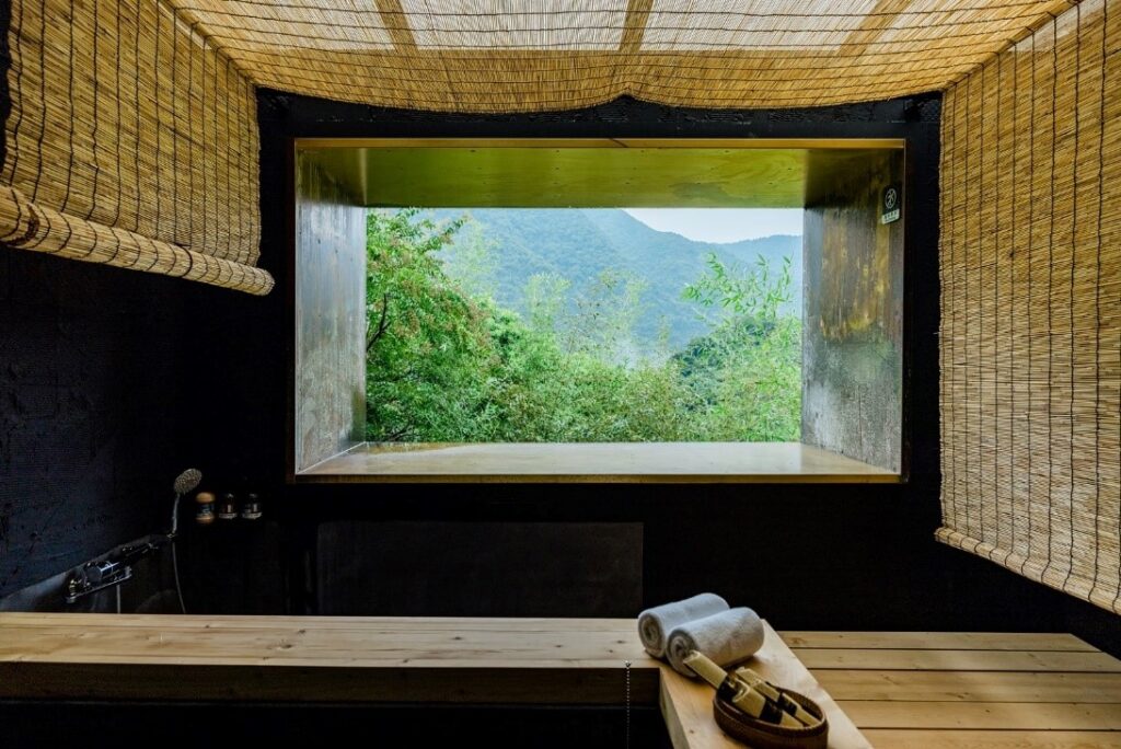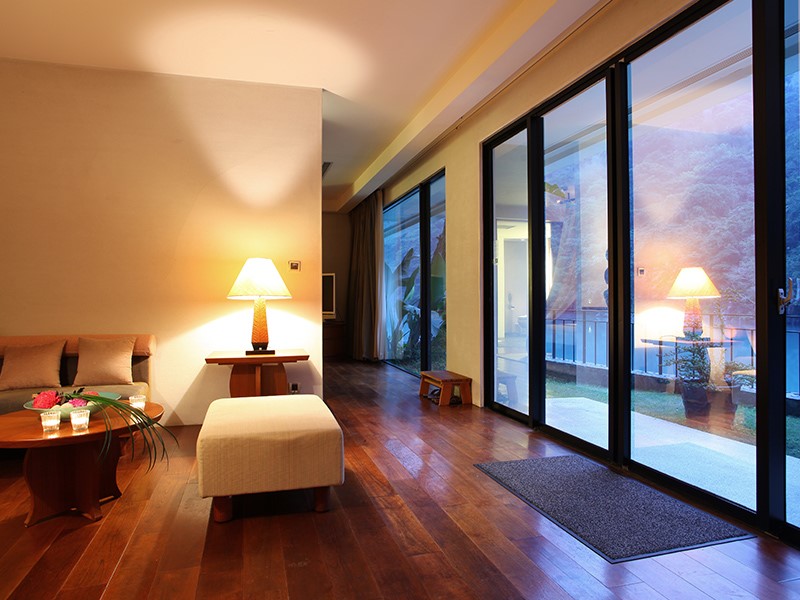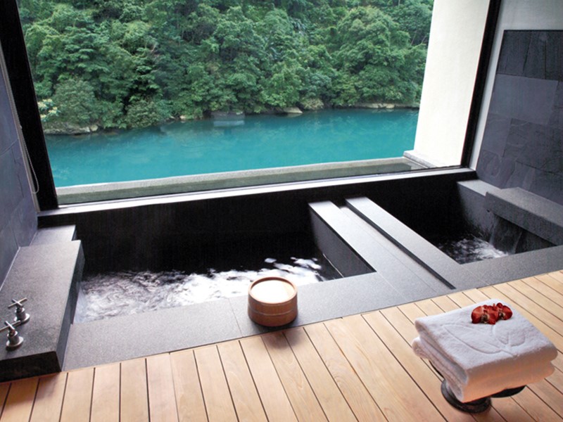 獨立的個人湯屋,讓您及一起泡湯的親友,享有寧靜的私密空間,自然石材切砌的浴室,大片的景觀窗盡收室外的山水風光,讓您猶如置身在自然之中